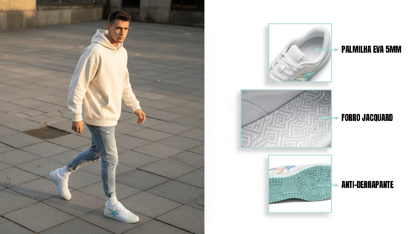 Palmilha EVA 5 mm + forro Jacquard = conforto real o dia todo. Solado aderente para mais segurança no rolê.