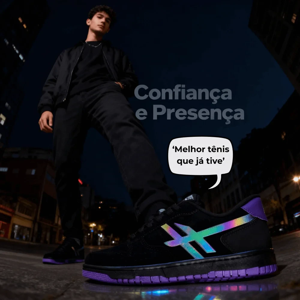 Cabedal: material com detalhe refletivo (acabamento premium)